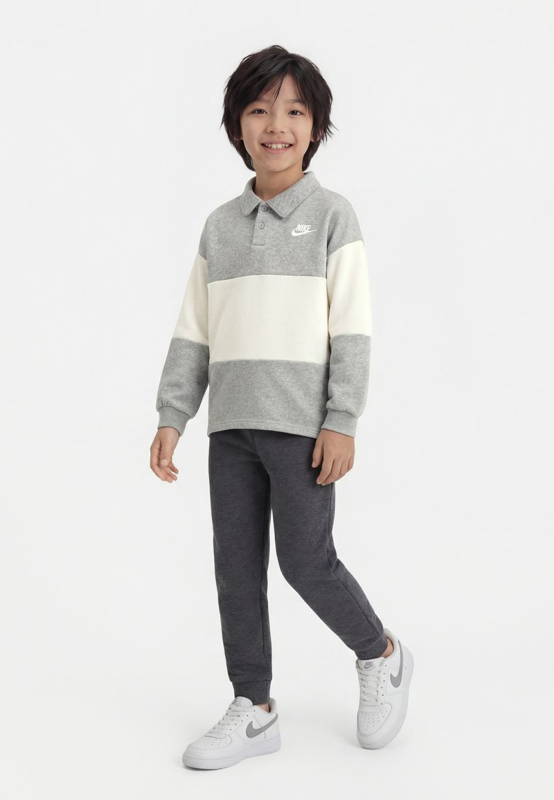 Χαμογελαστό αγόρι με γκρι και λευκή μπλούζα Nike, σκούρα γκρι παντελόνια φόρμας και λευκά αθλητικά Nike, στέκεται σε λευκό φόντο.