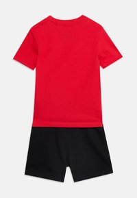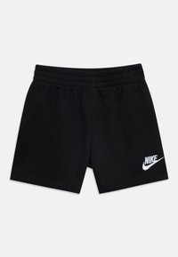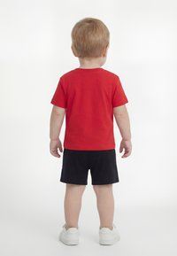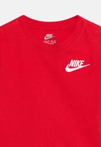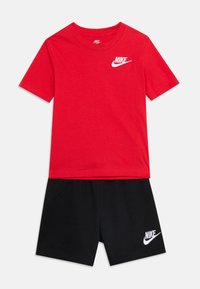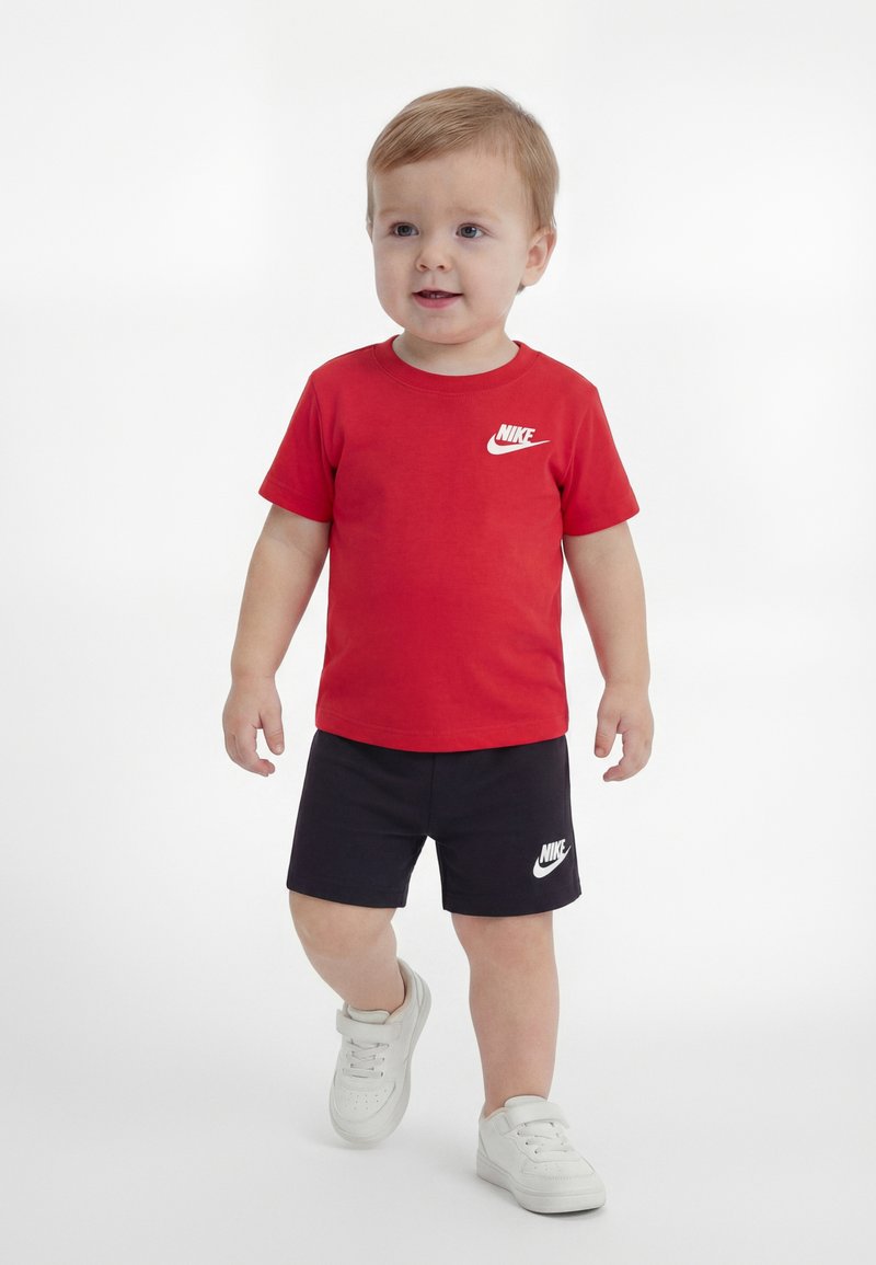 Νήπιο με κοντά ανοιχτό καστανά μαλλιά που φοράει κόκκινη μπλούζα Nike, μαύρα σορτς Nike και λευκά αθλητικά παπούτσια, στέκεται σε λευκό φόντο.