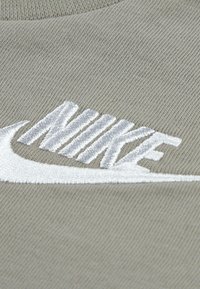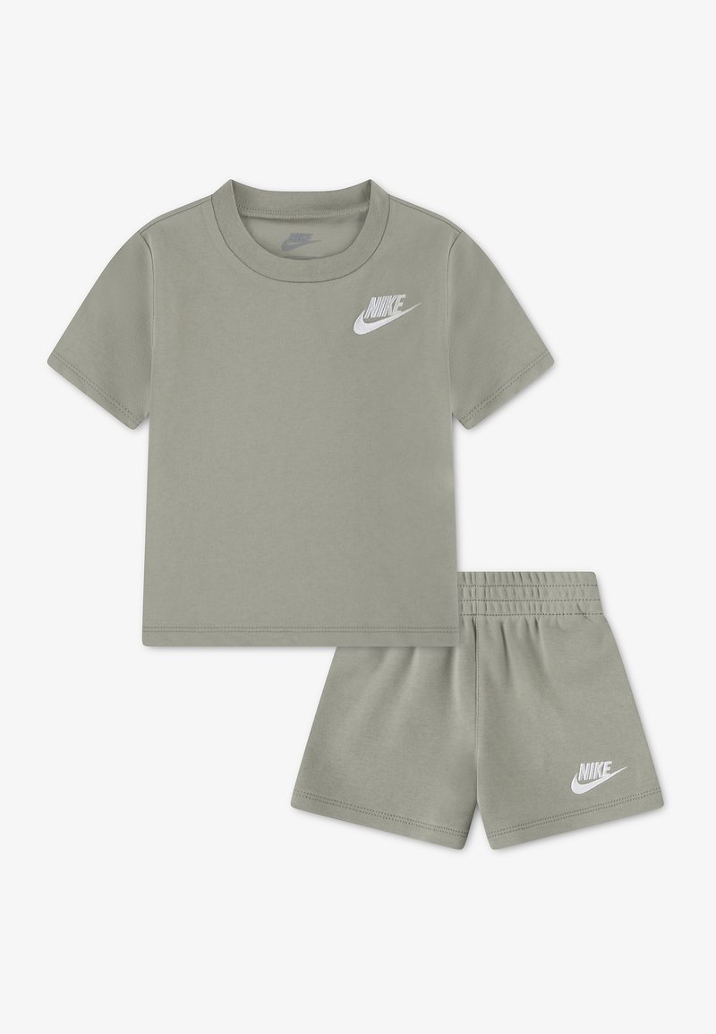 Σετ παιδικό γκρι t-shirt με κοντά μανίκια και σορτς με ελαστική μέση, με λευκό λογότυπο Nike στο στήθος και στο αριστερό πόδι.
