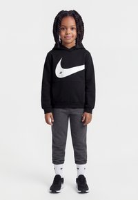 Παιδί με πλεγμένα μαλλιά στέκεται φορώντας μαύρο φούτερ Nike με κουκούλα, σκούρες γκρι φόρμες, λευκές κάλτσες Nike και μαύρα αθλητικά παπούτσια Nike σε λευκό φόντο.