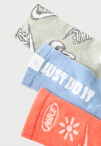 Τρία καλσόν Nike σε κοραλί, ανοιχτό μπλε και γκρι με λογότυπα και το κείμενο "JUST DO IT" στο ανοιχτό μπλε ζευγάρι, με λευκές λεπτομέρειες στα δάχτυλα και τη φτέρνα.