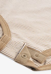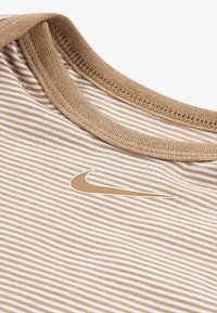 Δύο μπεζ κορμάκια μωρού με κοντά μανίκια—ένα ριγέ και ένα με μικρά λογότυπα—και αντίστοιχα μπεζ σορτσάκια με ελαστική μέση, όλα με λευκό λογότυπο Nike.