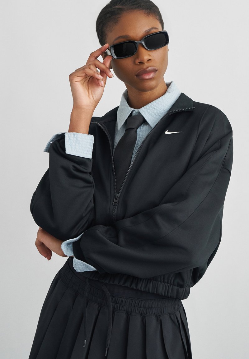 Γυναίκα που φοράει μαύρο αθλητικό μπουφάν, γαλάζιο πουκάμισο, μαύρη γραβάτα και μαύρα γυαλιά ηλίου, ποζάροντας με το χέρι να ρυθμίζει τα γυαλιά.