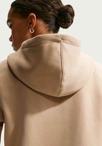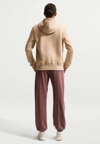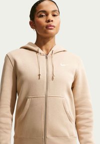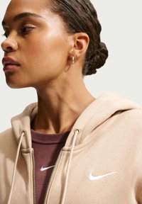Νέα γυναίκα που στέκεται, φοράει μπεζ φούτερ με φερμουάρ, μπορντό φούτερ και παντελόνια Nike, και λευκά αθλητικά παπούτσια, σε απλό ανοιχτό φόντο.