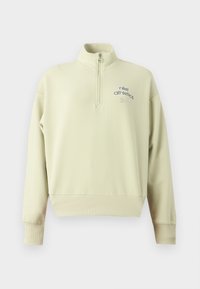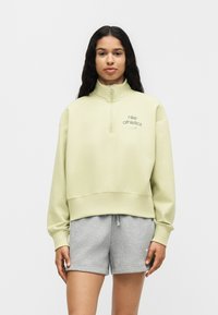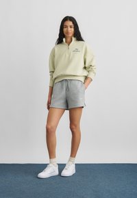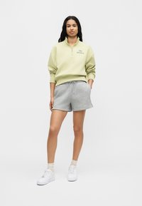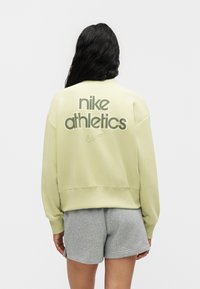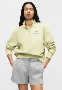 Νεαρή γυναίκα που φοράει ένα ανοιχτό μπεζ φούτερ Nike Athletics με φερμουάρ στο 1/4 και γκρι σορτς Nike με κορδόνια, στέκεται με το ένα χέρι στην τσέπη.