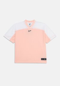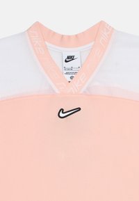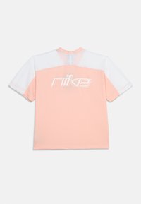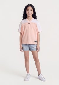 Κορίτσι όρθιο, φοράει αθλητικό πουκάμισο Nike σε ροδακινί και λευκό, σκισμένο τζιν σορτς και λευκά αθλητικά παπούτσια, χαμογελώντας με τα χέρια χαλαρά στο πλάι.