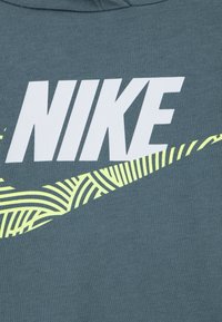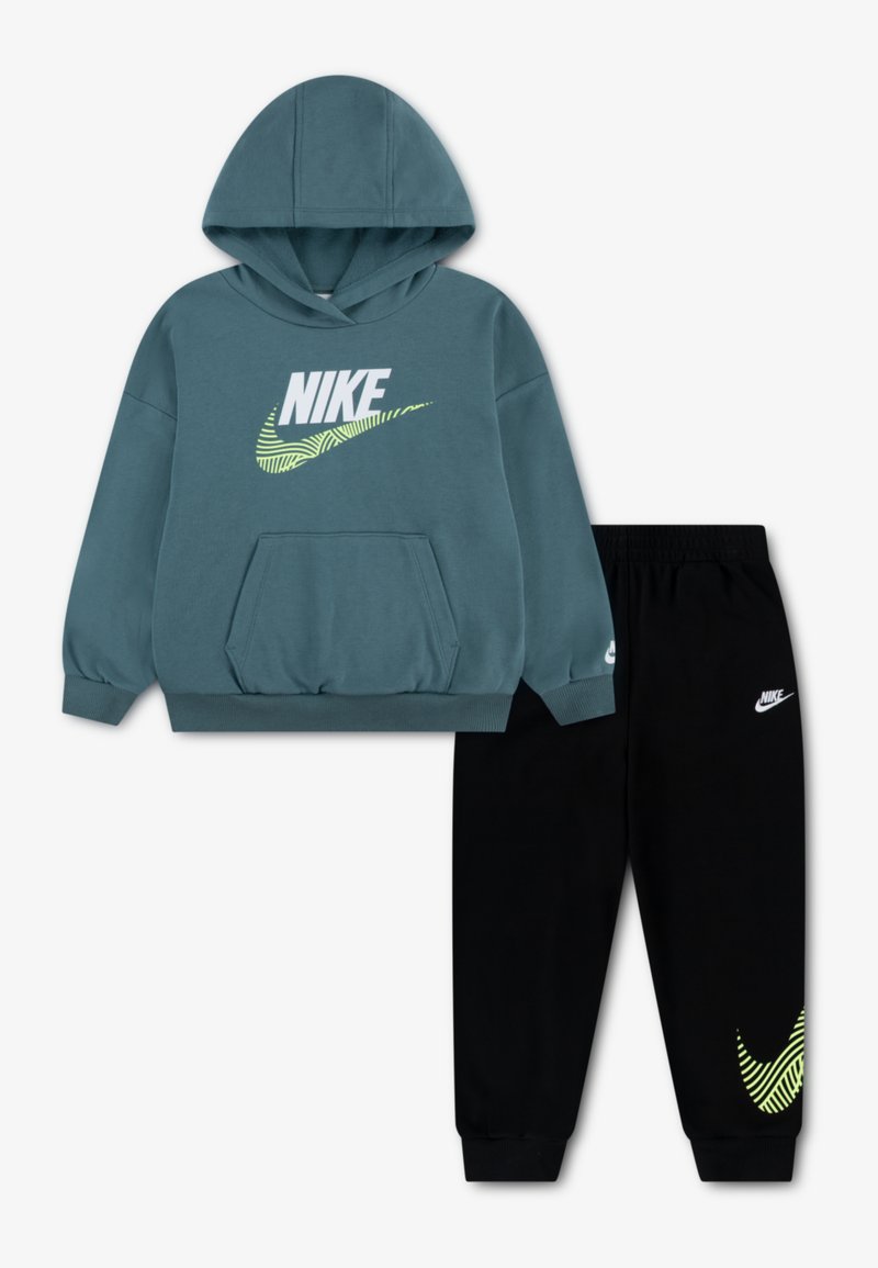 Σετ παιδική μπλούζα με κουκούλα και παντελόνι φόρμας. Η μπλούζα με κουκούλα είναι τιρκουάζ με λευκό λογότυπο Nike και πράσινη λεπτομέρεια. Το παντελόνι είναι μαύρο με μικρό λευκό λογότυπο και πράσινη λεπτομέρεια.