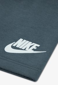 Λευκό κοντομάνικο t-shirt Nike με πολλαπλά πράσινα και μαύρα λογότυπα, συνδυασμένο με σκούρο πράσινο σορτς Nike με λευκό λογότυπο στο αριστερό πόδι.