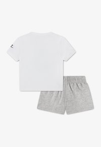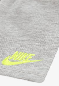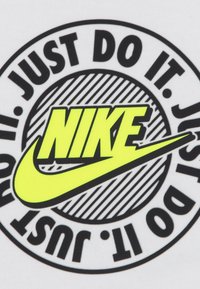 Λευκό T-shirt της Nike με νεον λογότυπο και το κείμενο "Just Do It", συνδυασμένο με γκρι σορτς με ελαστική μέση της Nike και νεον λογότυπο.