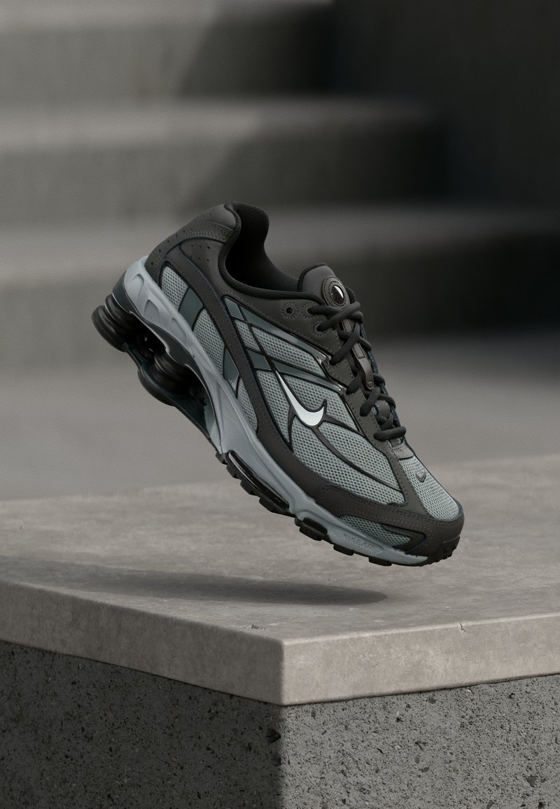 Γκρι και μαύρο αθλητικό παπούτσι με πλέγμα και χοντρή σόλα, τοποθετημένο στον αέρα πάνω από ένα τσιμεντένιο περιθώριο με σκάλες στο βάθος.