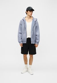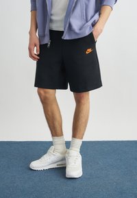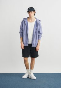 Άνθρωπος που φοράει μαύρα σορτς Nike με πορτοκαλί λογότυπο, λευκές κάλτσες, λευκά αθλητικά παπούτσια Nike και μωβ ανοιχτό μπουφάν με φερμουάρ πάνω από λευκό πουκάμισο.