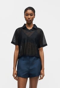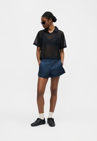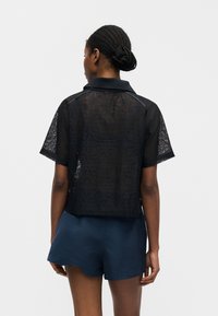 Γυναίκα με πλεξούδα που φοράει διάφανη μαύρη πουκάμισο με σχέδια και μπλε σορτς, καθισμένη σε μεταλλική καρέκλα με απλό φόντο.