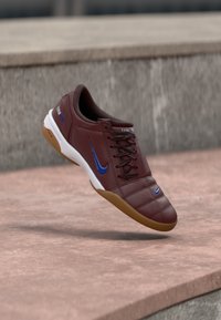 Παπούτσια Nike από δέρμα μπορντό με μπλε λεπτομέρειες, υφή με ανάγλυφο σχέδιο, σόλα από καουτσούκ και αντίθετη λευκή ενδιάμεση σόλα.
