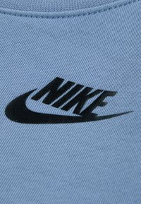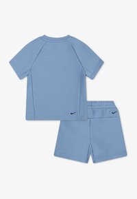 Σετ παιδικό κοντομάνικο μπλουζάκι και σορτς με ελαστική μέση σε ανοιχτό μπλε χρώμα από τη Nike, με μαύρα λογότυπα Swoosh και μαύρη λεπτομέρεια στην τσέπη του σορτς.