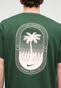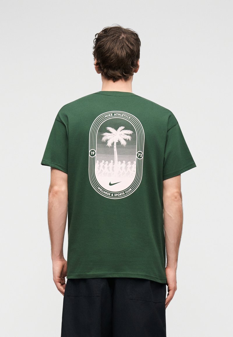 Άνδρας που φοράει σκούρο πράσινο T-shirt με λευκό σχέδιο φοίνικα και λογότυπο Nike Athletics στην πλάτη, συνδυασμένο με μαύρο σορτς, στέκεται με την πλάτη γυρισμένη.