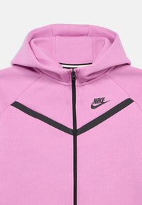 Ροζ φούτερ Nike με φερμουάρ μπροστά, κουκούλα, μαύρες λεπτομέρειες στους ώμους και το τελείωμα, κατασκευασμένο από απαλό, ελαστικό ύφασμα και με εφαρμοστό σχέδιο.