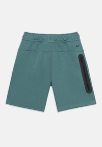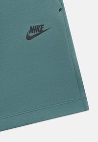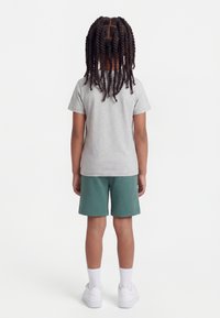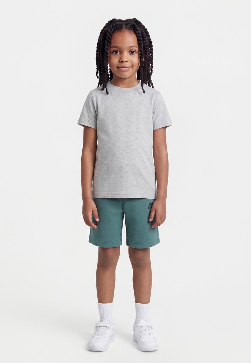 Παιδί με πλεξούδες, φορόντας γκρι ανοιχτό κοντομάνικο πουκάμισο, πετρόλ σορτς, λευκές κάλτσες και λευκά αθλητικά παπούτσια, στέκεται σε λευκό φόντο.