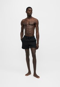 Άνδρας με σκούρο δέρμα χωρίς πουκάμισο, φορούντας μαύρο μαγιώ, στέκεται μπροστά σε ένα απλό φωτεινό φόντο, κοιτάζοντας μπροστά.