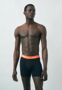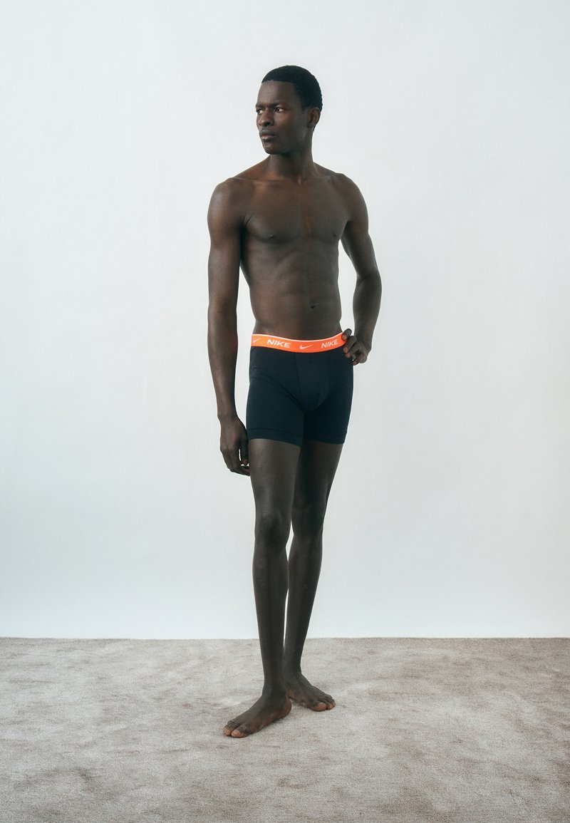 Άνδρας χωρίς πουκάμισο, όρθιος ξυπόλητος σε χαλί, φοράει μαύρα εσώρουχα Nike με πορτοκαλί ζώνη, κοιτάζοντας προς τα αριστερά σε απλό φόντο.
