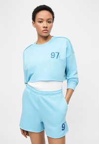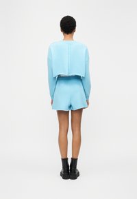 Άτομο που φοράει σορτς με ελαστική μέση σε ανοιχτό μπλε χρώμα, ταιριαστό cropped φούτερ και μαύρα μποτάκια με κορδόνια και πλατφόρμα, στέκεται μπροστά σε απλό φόντο.