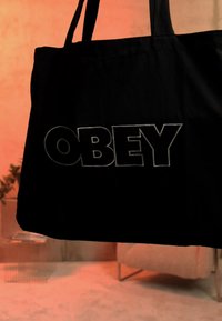 Μαύρη τσάντα ώμου από ύφασμα με μακριές λαβές, που φέρει τη λέξη "OBEY" με μεγάλα, έντονα γράμματα περιγραμμένα με άσπρο χρώμα στο μπροστινό μέρος.