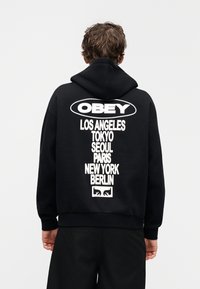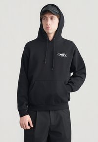 Μαύρο φούτερ με κουκούλα και μπροστινή τσέπη, με λευκό λογότυπο "OBEY". Υλικό από λείο βαμβακερό μείγμα, άνετη εφαρμογή, με ρυθμιζόμενα κορδόνια.