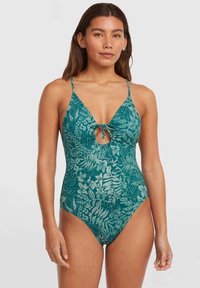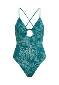 Μαγιό με βαθύ ντεκολτέ, λεπτομέρεια με άνοιγμα, πράσινο ύφασμα με λευκό σχέδιο φύλλων, λεπτές ρυθμιζόμενες τιράντες και σχέδιο με ψηλή κόψη στο πόδι.