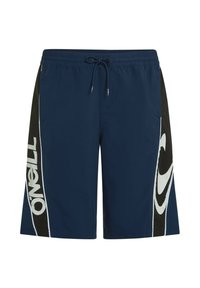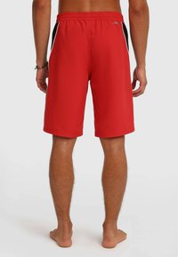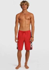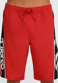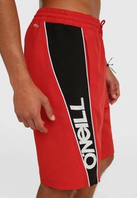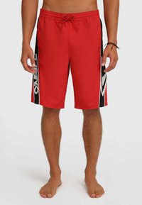 Κόκκινα μαγιό σορτς με μαύρη πλαϊνή ρίγα που διαθέτει λευκό λογότυπο και σχέδιο βέλους, ελαστική μέση και σύστημα δέσιμου με κορδόνι.