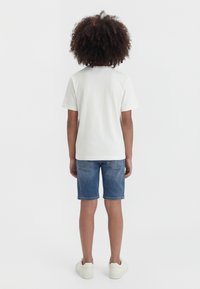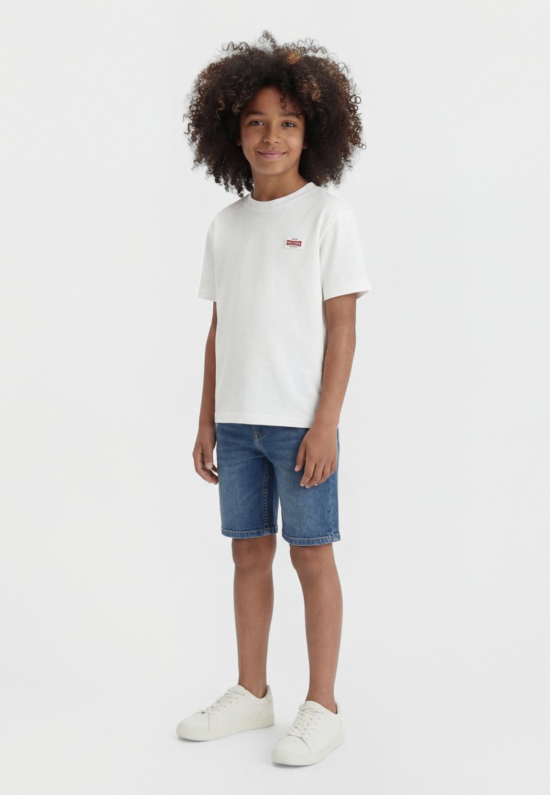Παιδί με κατσαρά μαλλιά που φορά λευκό μπλουζάκι με λογότυπο, μπλε τζιν σορτς και λευκά αθλητικά, στέκεται και χαμογελάει μπροστά σε λευκό φόντο.
