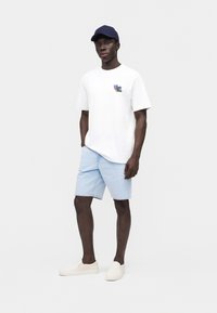Άνδρας που φοράει λευκό T-shirt με πολύχρωμο αφηρημένο λουλουδένιο σχέδιο και κείμενο "only and sons" στην πλάτη, συνδυασμένο με ανοιχτόχρωμα τζιν σορτς.