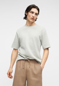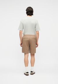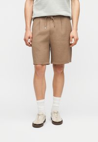 Άνδρας που φοράει ανοιχτό καφέ σορτς με κορδόνια, λευκές κάλτσες και μπεζ αθλητικά παπούτσια, στέκεται μπροστά σε έναν απλό ανοιχτό φόντο.