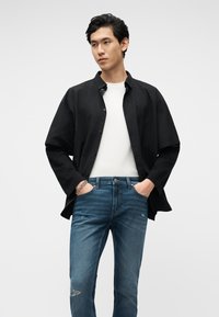 Άνδρας που φορά στενά μπλε τζιν με μικρή σκισμένη τρύπα στο γόνατο, μαύρο πουκάμισο με κουμπιά και μαύρα αθλητικά παπούτσια με λευκές ρίγες, στέκεται σε απλό φόντο.