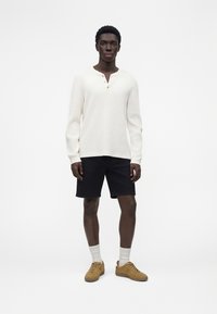 Άνδρας με μαύρα τζιν σορτς, λευκές ριβ ύφανσης κάλτσες, μπεζ δερμάτινα sneakers με κορδόνια και λευκό πλεκτό πουλόβερ με μακριά μανίκια, στέκεται μπροστά σε λευκό φόντο.