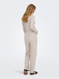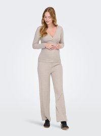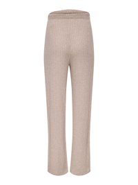 Μπεζ παντελόνι πλεκτό με ριμπ ύφανση και φαρδιά γραμμή, συνδυασμένο με το αντίστοιχο πλεκτό τοπ με ριμπ μακρυμάνικο και μαύρα αθλητικά παπούτσια με καφέ σόλες.