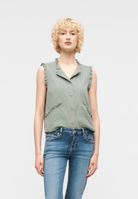 Νεαρή γυναίκα με ξανθά σγουρά μαλλιά φοράει αμάνικη ανοιχτοπράσινη μπλούζα με κουμπιά και βολάν, συνδυασμένη με μπλε τζιν, μπροστά από μια απλή φόντο.