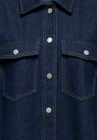 Φόρεμα πουκάμισου από τζιν σε σκούρο μπλε χρώμα με κοντά μανίκια, δύο τσέπες στο στήθος, κούμπωμα με κουμπιά μπροστά και ραφές με αντίθεση. Ομαλή υφή.