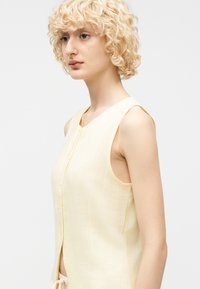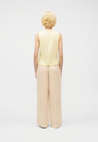 Γυναίκα που φοράει μπεζ λινό παντελόνι με φαρδιά μπάσκα και κορδόνι στη μέση, αμάνικη ανοιχτοκίτρινη μπλούζα και καφέ δερμάτινα σανδάλια, στέκεται σε λευκό πάτωμα.