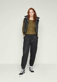 Ελιά κίτρινη υφασμένη μπλούζα με μακριά μανίκια και φαρδύ λαιμό, συνδυασμένη με μαύρο cargo παντελόνι με ελαστική μέση, που επιδεικνύει άνετη εφαρμογή.