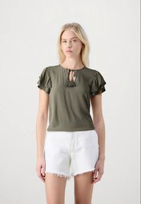 Ελιά πράσινη μπλούζα με ριχτές κοντές μαν sleeves, λαιμόκοψη με κλειδί και κορδόνια, σε συνδυασμό με λευκά σορτς με φθαρμένο τελείωμα. Λείος υφασμάτινος.