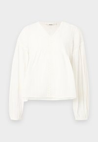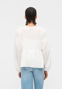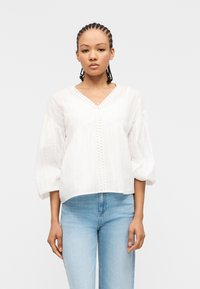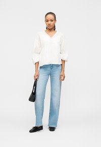 Γυναίκα με πλεξούδες, που φοράει λευκή μπλούζα με ανάγλυφη υφή και δαντελωτή λεπτομέρεια, καθώς και ανοιχτό μπλε τζιν, στέκεται μπροστά σε απλό λευκό φόντο.