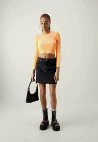 Μακρυμάνικο, κοντό τοπ από πορτοκαλί ριγωτό ύφασμα, συνδυασμένο με μια ψηλόμεση μαύρη τζιν φούστα με κατεστραμμένο στρίφωμα και μπροστινές τσέπες.