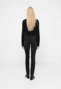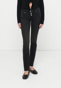 Μαύρο τζιν με στενή γραμμή, πέντε τσέπες και εμπρόσθιο κούμπωμα με τρία κουμπιά. Συνδυασμένο με μαύρες μπαλαρίνες.