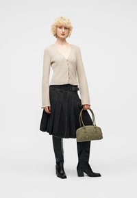 Ξανθό άτομο με σγουρά μαλλιά, φορούν μπεζ πλεκτή ζακέτα με V λαιμόκοψη και κουμπιά, και μαύρη πλισέ φούστα με ψηλή μέση και ζώνη.