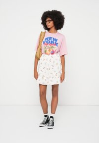 Απαλό ροζ κοντό t-shirt με μπλε και κόκκινο γραφικό κείμενο που γράφει "New York Big Apple", με εικόνα ροδάκινου και λευκή φλοράλ φούστα.