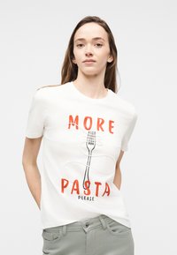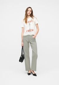 Γυναίκα που φοράει ανοιχτογκρι παντελόνια με φαρδιά πόδια, μαύρα φλατ παπούτσια με μυτερή μύτη και ένα λευκό κοντό πουκάμισο με πορτοκαλί κείμενο, στέκεται μπροστά σε λευκό φόντο.