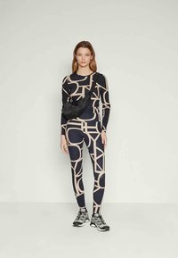 Αθλητική μπλούζα με μακρύ μανίκι και κολάν από μαύρο ύφασμα με μεγάλες μπεζ γεωμετρικές σχέσεις, εφαρμοστή γραμμή και στρογγυλή λαιμόκοψη.