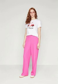 Λευκό βαμβακερό T-shirt με γραφικό μωβ σκούτερ με κόκκινες γυαλιστερές λεπτομέρειες και το κείμενο "Cityscape Paris 90," συνδυασμένο με ροζ παντελόνι.