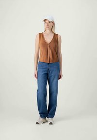 Καφέ ριμπ αμάνικο τοπ με βαθύ V-ντεκολτέ και κουμπί μπροστά. Συνδυασμένο με μπλε τζιν, που αναδεικνύει μια άνετη εφαρμογή.