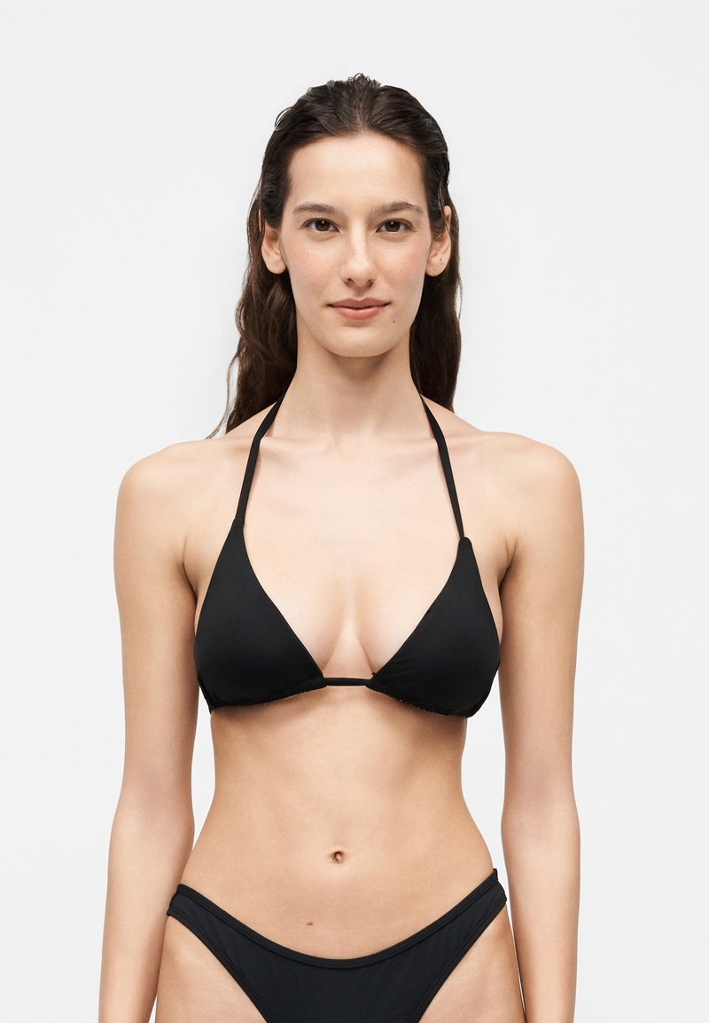 Νεαρή γυναίκα με μακριά σκούρα μαλλιά, που φοράει μαύρο μαγιό μπικίνι με τρίγωνο τοπ και αντίστοιχο κάτω μέρος, με φόντο απλό και φωτεινό.