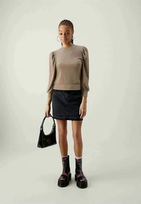 Φωτεινός καφέ ριγέ πουλόβερ με φουσκωτούς ώμους, στρογγυλή λαιμόκοψη και στενό περιθώριο, σε συνδυασμό με μια μαύρη τζιν μίνι φούστα με φθαρμένα άκρα.